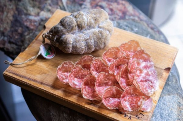 一頭の豚から一個しかとれない貴重な腸を使用した大きなサラミ。